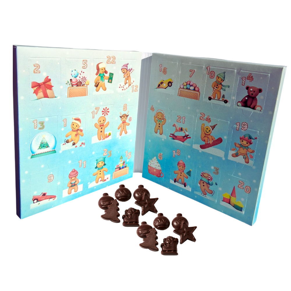 Faites rêver les enfants (et les grands gourmands !) avec le calendrier de l’Avent “Teddy l’Ourson”, une édition joyeuse et colorée. Chaque jour, ouvrez une case et découvrez une friture en chocolat noir ou au lait, en forme de symboles festifs : étoiles, sapins, bonshommes de neige, cadeaux ou boules de Noël.