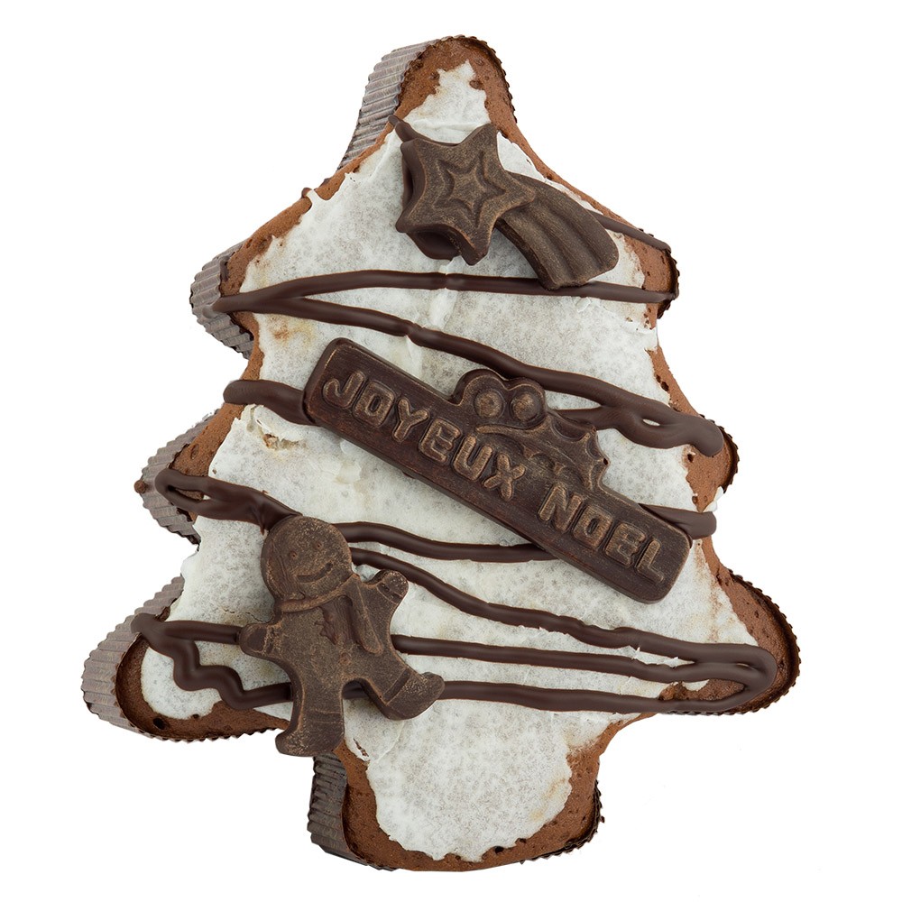Pain d'épice nature "spécial Noël" en forme de sapin, décoré de chocolat.