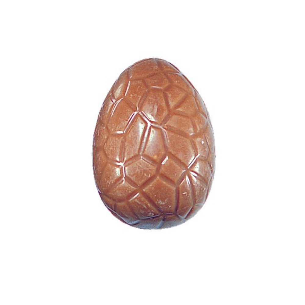 L'incontournable Oeuf de Pâques avec son décor moulé tissé.Ce moulage de 15 cm de haut au très bon chocolat, cache des petites fritures et pralinés.